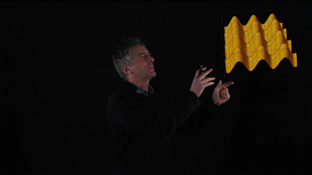 Il docente è ripreso frontalmente con l’intero busto e può scrivere sulla lavagna o sulle immagini che vengono proiettate.