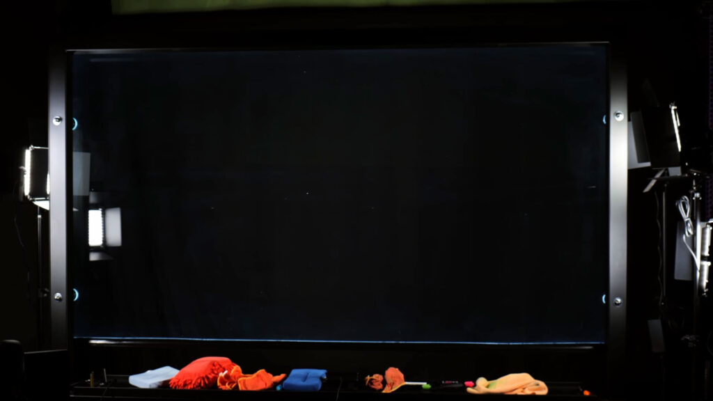 (largh. 220 cm) con: vetro ultraclear 220 X 120, mensola portaoggetti, contenitori per pennarelli e spugne, delimitatori inquadratura in legno, LED impermeabili 5m, telaio in ferro solido con possibilità di fissaggio a terra con 2 mani di vernice nera e una antiruggine.